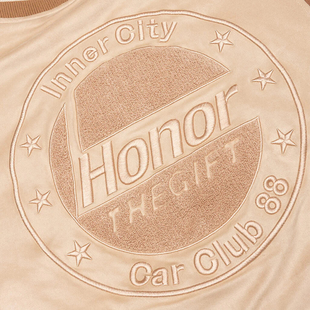 The Oil Head Varsity is the latest addition from Honor The Gift. Composed of soft peached polyester, this jacket features a button closure at the front, ribbed elastic trims, and side pockets for storage. The look is highlighted by the tonal chenille Oil head graphic at the back, with additional embroidery at the chest. Custom ribbing and contrast piping are some finishing touches to the design.